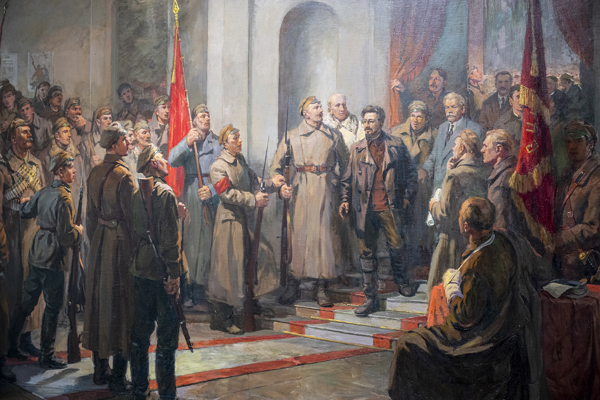 Ojārs Ābols. Jakovs Sverdlovs latviešu strēlnieku vidū Rīgā 1919. gadā. Audekls, eļļa, 226 x 300 cm, 1951. Latvijas Kara muzejs. Foto – Kristaps Kalns