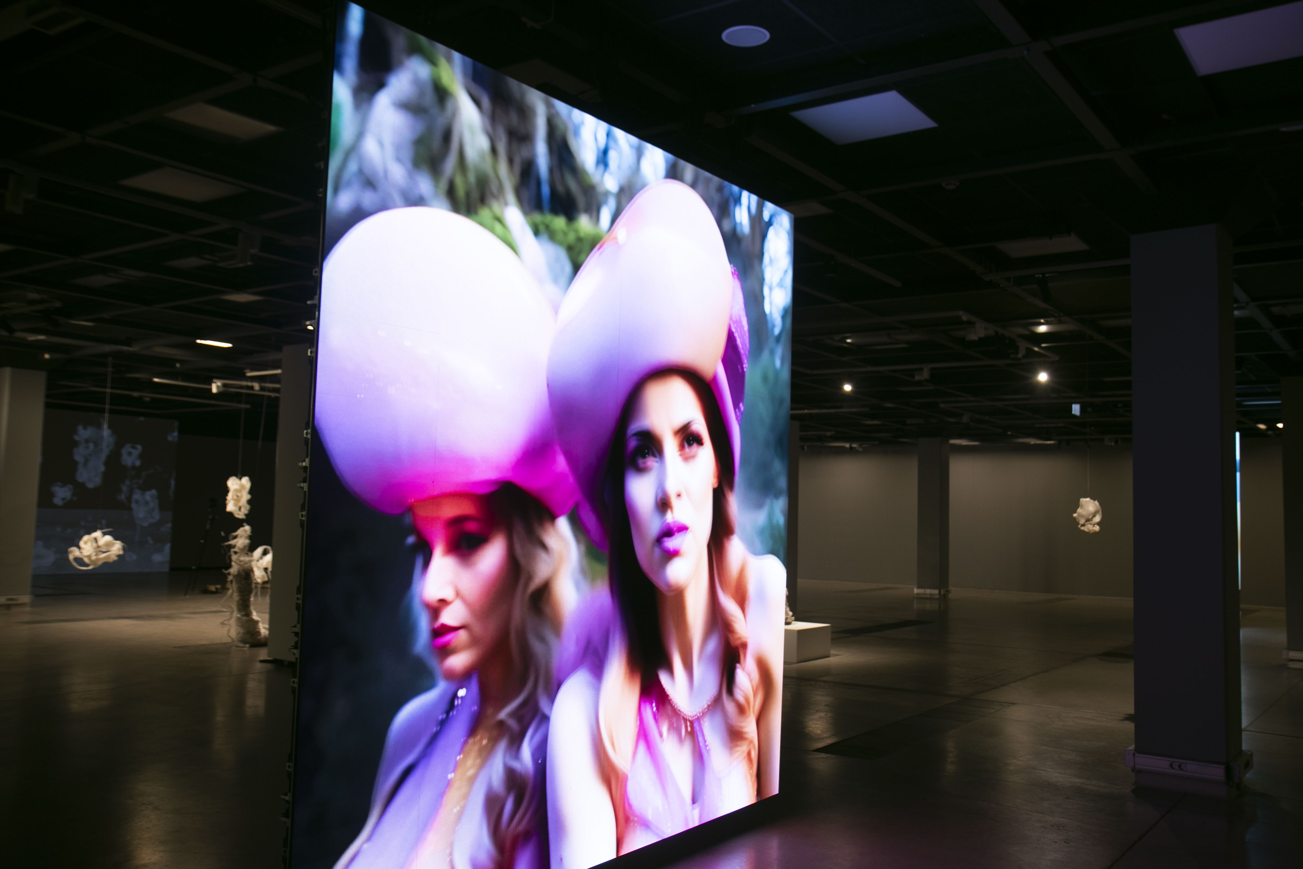 Lielajā zālē vērojama ekrānu māksla – videoinstalācijas –, kā arī vairākas sēņu micēlija skulptūras no polietilēna. Tās šūpojas gaisā starp skatītājiem, taču šķiet, ka to īstā dzīve ir otrpus ekrānam, kur viss izskatās viegls un ēterisks. Turklāt instalācijas nosaukums (Bez nosaukuma (SEX ar skulptūrām); 2026; reālā laikā ģenerēta mākslīgā intelekta videoinstalācija, polietilēna un sēņu micēlija skulptūras) liecina, ka notiek sekss ar skulptūrām. Vēl daži darbi paredz interakciju, skatītāju iesaisti tādā veidā, ka viņi, nostājoties kameras priekšā, iekļūst Ginta Gabrāna Matriksā mazliet mainītā izskatā vai arī pārvērsti par sēni. Jāatzīst, ka, to vērojot, manī pamodās gluži vai tumsonīga piesardzība – nez kāpēc sajutos līdzīgi kā stāstā par ļaudīm, kas baidījās no fotografēšanas, jo uzskatīja, ka attēls var piesavināt cilvēka dvēseli. Tas vedina distopiskas pārdomas: principā jau neviens cilvēks nezina, kādu lomu mākslīgā intelekta režijā tuvākā vai tālākā nākotnē nospēlēs viņa fotoatveids. Jo mēs taču gandrīz ik brīdi neapzināti ziedojam savu seju kādai digitālai mākoņpakalpojumu kolekcijai.